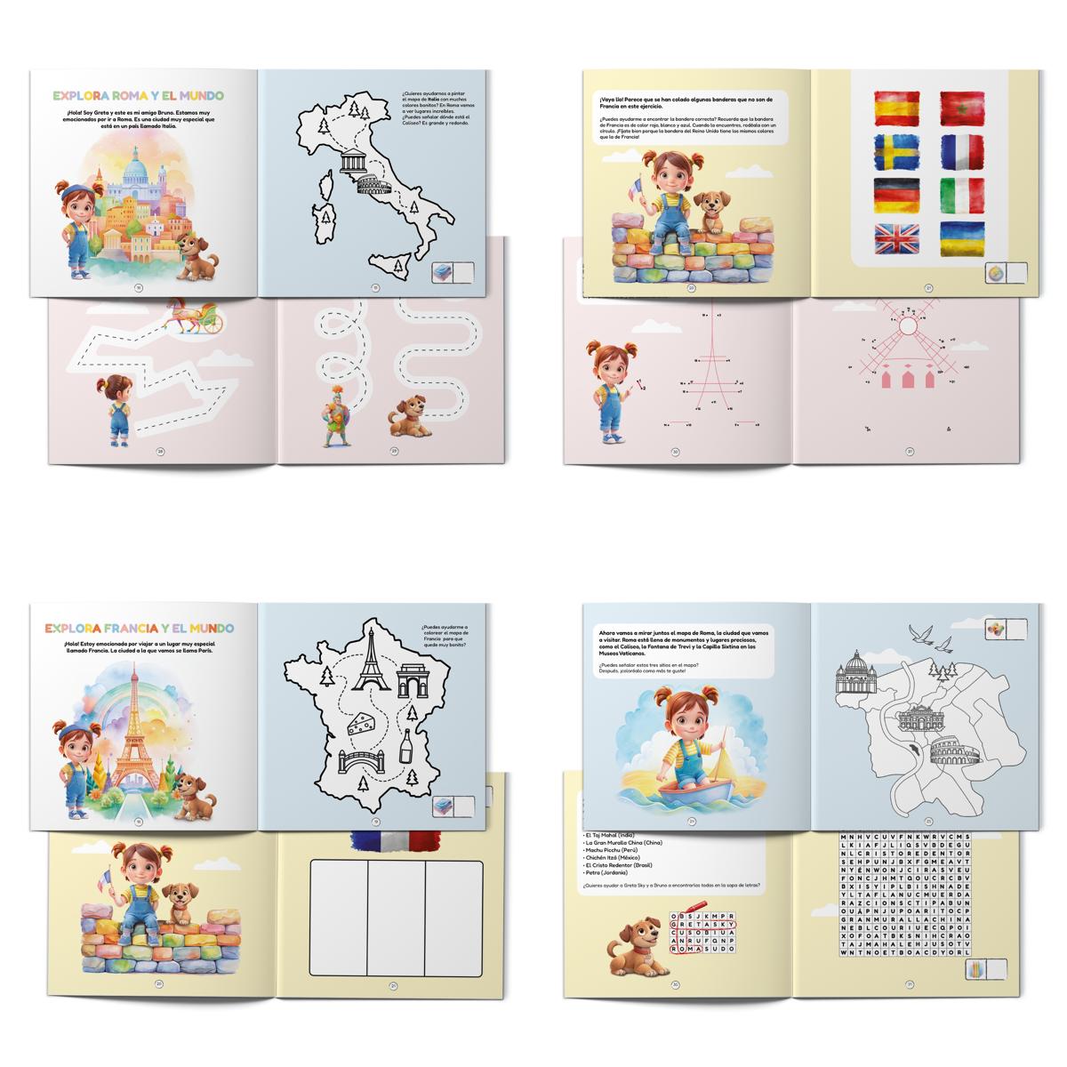 Junto a Greta Sky y su perro Bruno, los pequeños exploradores prepararán su maleta, marcarán los transportes que utilicen y señalarán las comidas que prueben. Además, disfrutarán de retos como adivinanzas, laberintos, juegos sobre geografía, monumentos, gastronomía y muchas más sorpresas.